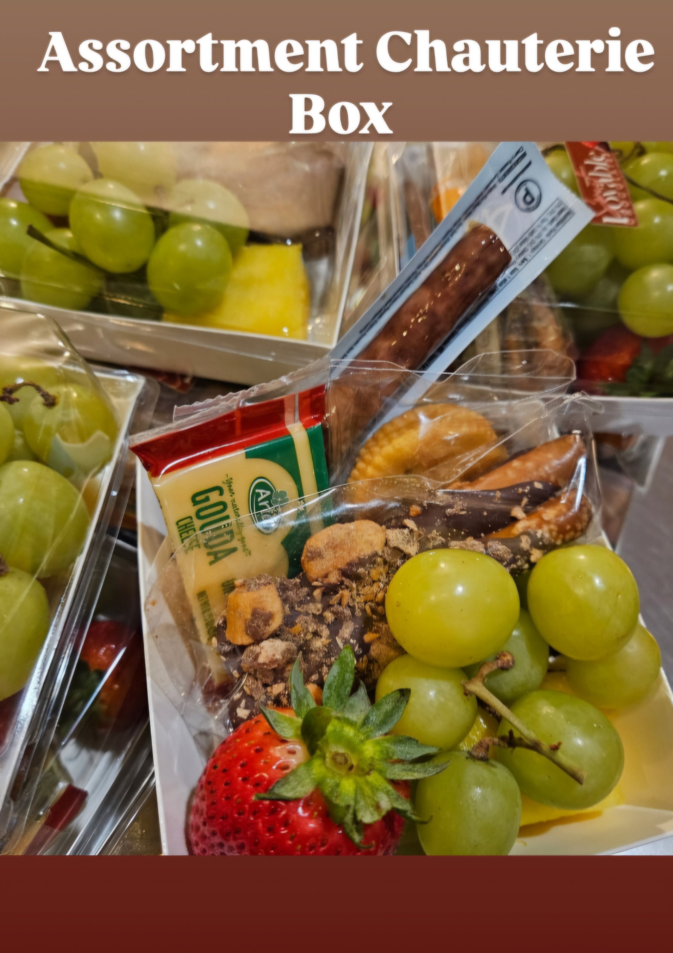 Indulge in a carefully selected assortment of tasty fruits, nuts, cheeses, chocolate, honey stick, crackers, pepperoni, or chicken nugget with our charcuterie box, suitable for any time of year. 6 boxes with pepperoni and 6 boxes with chicken nuggets.