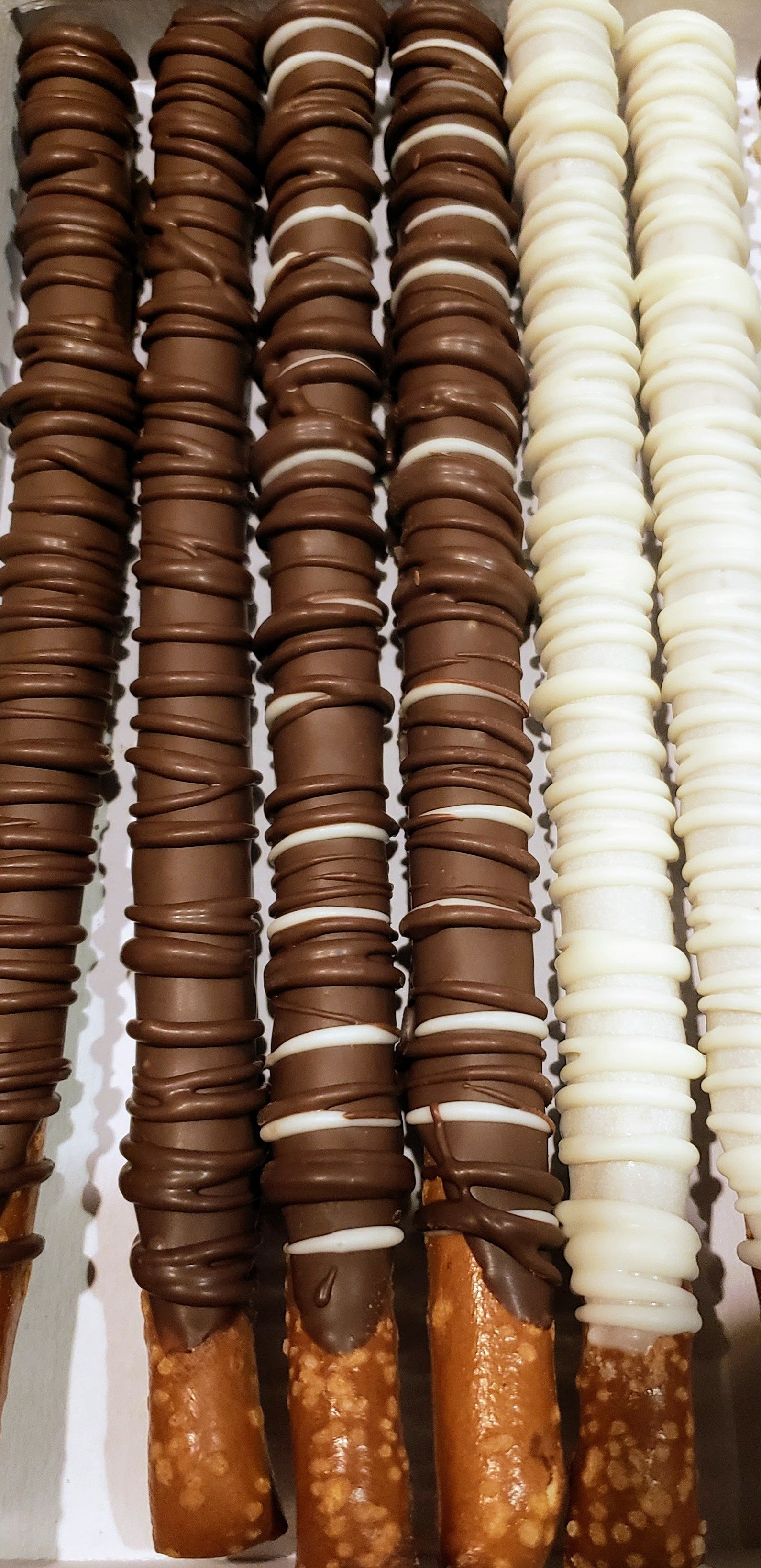 6 Fresh, Crispy, Sweet And Salty, Hand Dipped Assortment Of Chocolate Covered Pretzels. White Chocolate Covered Pretzels, Milk Chocolate Covered Pretzels, Milk Chocolate Covered Pretzels With White Chocolate Drizzles, White Chocolate Covered Pretzel With Milk Chocolate Drizzles. Made To Order.